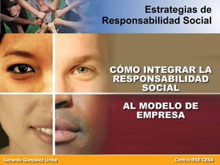 El documento habla sobre estrategias de responsabilidad social empresarial. Discuten que para resolver problemas, se necesita un nuevo tipo de pensamiento. También analizan factores como el entorno, las fuerzas del mercado, y las posibles respuestas de las empresas a expectativas sociales en temas como derechos humanos y medio ambiente.