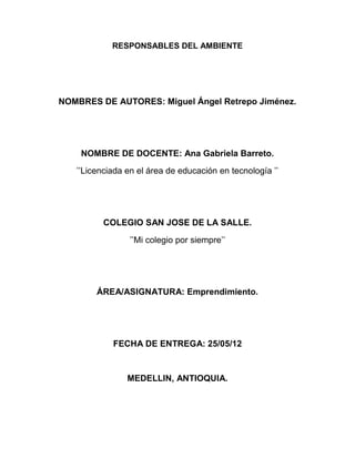 Este documento presenta las respuestas de un estudiante a preguntas sobre un cuento relacionado con el desarrollo sostenible y la protección del medio ambiente. El estudiante resume el cuento, explica el concepto de desarrollo sostenible y cómo contribuye personalmente. También enumera tres compromisos como defensor del planeta: reciclar, cuidar los recursos como el agua, y conservar el medio ambiente produciendo recursos de manera sostenible. Finalmente, considera que es posible mantener el bienestar de la pobl