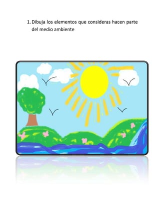 El documento habla sobre la importancia de cuidar el medio ambiente y la naturaleza. Explica que debemos protegerlos para poder disfrutar de los beneficios como el oxígeno, los frutos de los árboles, el agua limpia, y la vida silvestre. También menciona formas de ayudar como reciclar, ahorrar agua y energía, plantar árboles y no cazar animales.