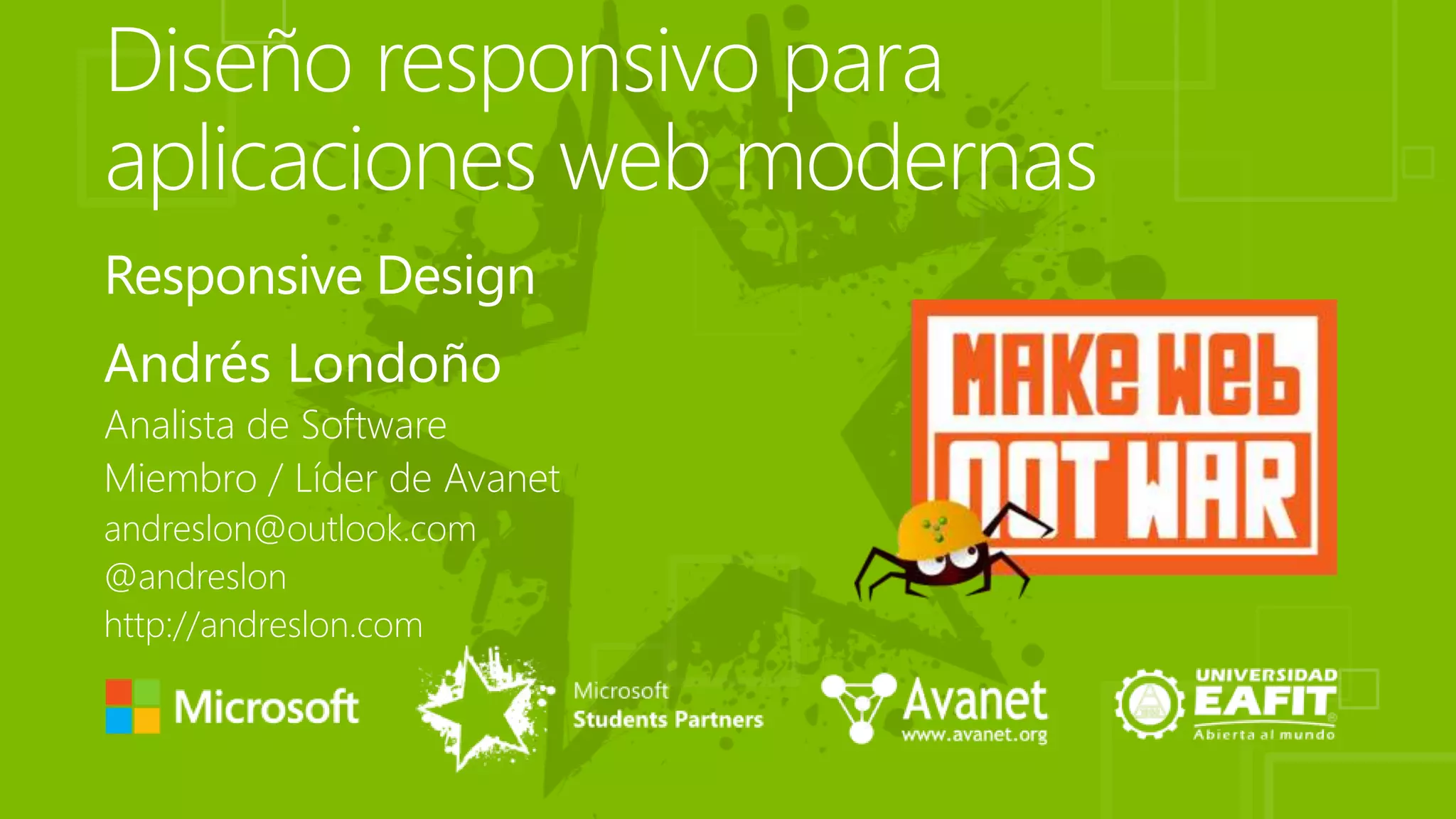 Andrés Londoño, analista de software y líder de Avanet, explica cómo adaptar automáticamente el zoom de la pantalla al ancho de la web. Se recomienda usar porcentajes para definir anchos y maximizar el tamaño de imágenes y videos. También se presentan consultas CSS basadas en el ancho del navegador y la orientación del dispositivo.