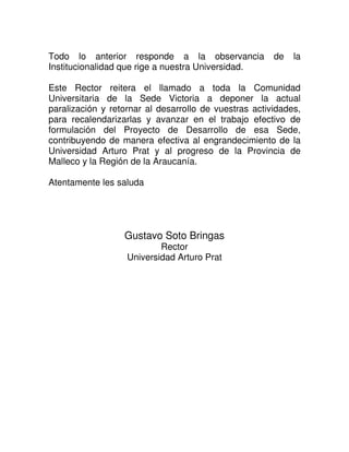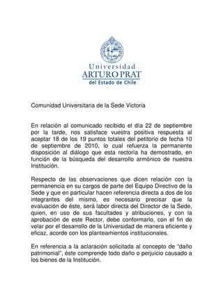 El rector de la Universidad Arturo Prat agradece la respuesta positiva a 18 de los 19 puntos del petitorio y reitera que la evaluación del equipo directivo de la sede estará a cargo del director de la sede. También aclara que el "daño patrimonial" se refiere a cualquier daño o perjuicio causado a los bienes de la institución. Finalmente, hace un llamado a retomar las actividades para avanzar en el proyecto de desarrollo de la sede y contribuir al progreso de la región.