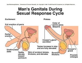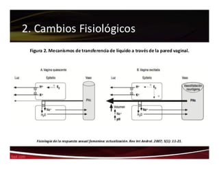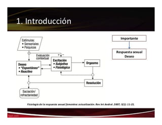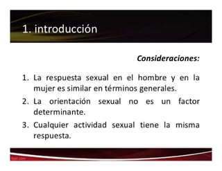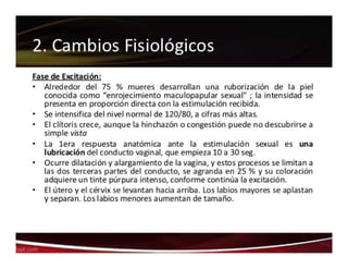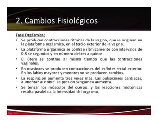 El documento detalla las fases de la respuesta sexual humana, incluyendo las fases de excitación, meseta, orgasmo y resolución, para ambos sexos. Se incluyen gráficos que ilustran las contracciones anales y los cambios de tensión durante estas fases, junto con la neurofisiología involucrada en la respuesta sexual. Además, se mencionan las interacciones fisiológicas y neurofisiológicas relacionadas con otros sistemas del cuerpo.