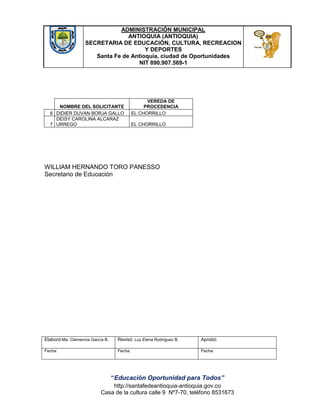 Este documento resume las decisiones tomadas por el Comité de Cupos del Municipio de Santa Fe de Antioquia sobre 7 solicitudes de asignación de cupos educativos. Se aprueban 5 solicitudes y se asignan los cupos correspondientes en diferentes establecimientos educativos de la región. Dos de las solicitudes son denegadas, una por ingreso a educación para adultos y otra por proceder de la vereda El Chorrillo. El documento está firmado por el Secretario de Educación del municipio.