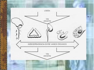 El documento describe la respuesta metabólica y neuroendocrina al trauma. Se explica cómo la reacción inespecífica del organismo permite sobrevivir inicialmente al trauma y adaptarse, aunque puede resultar en un síndrome de respuesta inflamatoria sistémica que cause daño a los órganos. También se detallan los efectos de la isquemia y reperfusión en el cerebro.