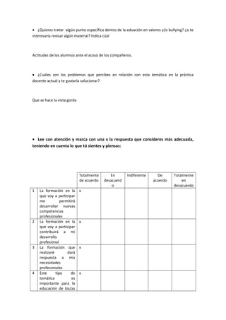 Este cuestionario recopila datos personales y profesionales de una participante en un curso de formación sobre detección de acoso escolar. La participante, María Miguélez Vila de 42 años y con 15 años de experiencia docente, indica que le gustaría aprender a detectar el acoso escolar y las actitudes de los alumnos ante este problema, así como abordar por qué a veces se ignora este tema. Manifiesta estar totalmente de acuerdo en que la formación le permitirá desarrollar nuevas competencias, contribuirá a su desarrollo