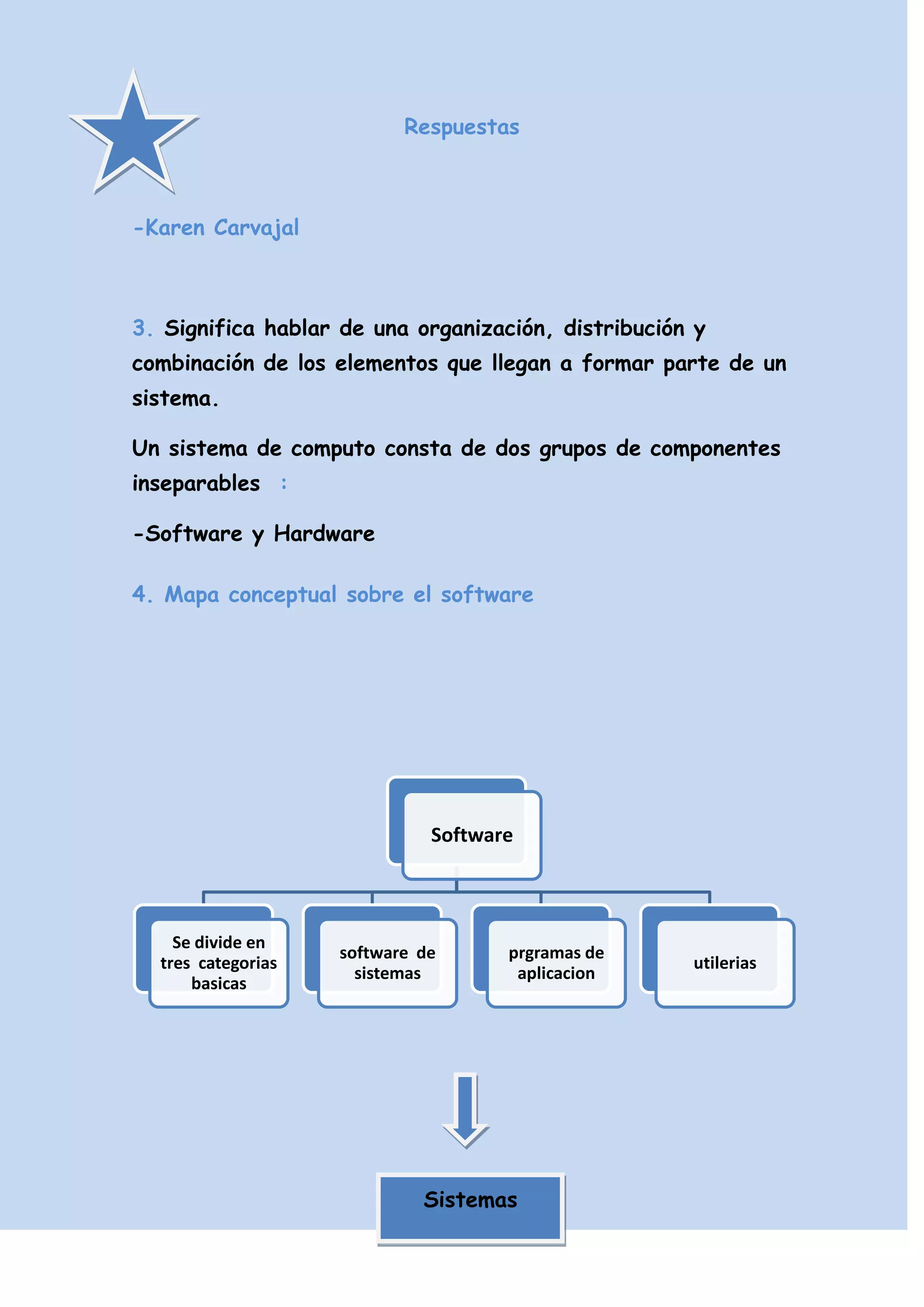 El documento describe los componentes principales de un sistema de computadora, incluyendo el software y hardware. El software incluye el sistema operativo y aplicaciones, mientras que el hardware incluye dispositivos de procesamiento, almacenamiento, entrada y salida. Luego explica los pasos involucrados en la ejecución de una aplicación, como la entrada de datos por el usuario, procesamiento por el microprocesador, almacenamiento temporal en la memoria RAM y visualización en la pantalla. Concluye que los computadores pueden realizar diversas tareas según las instrucciones del