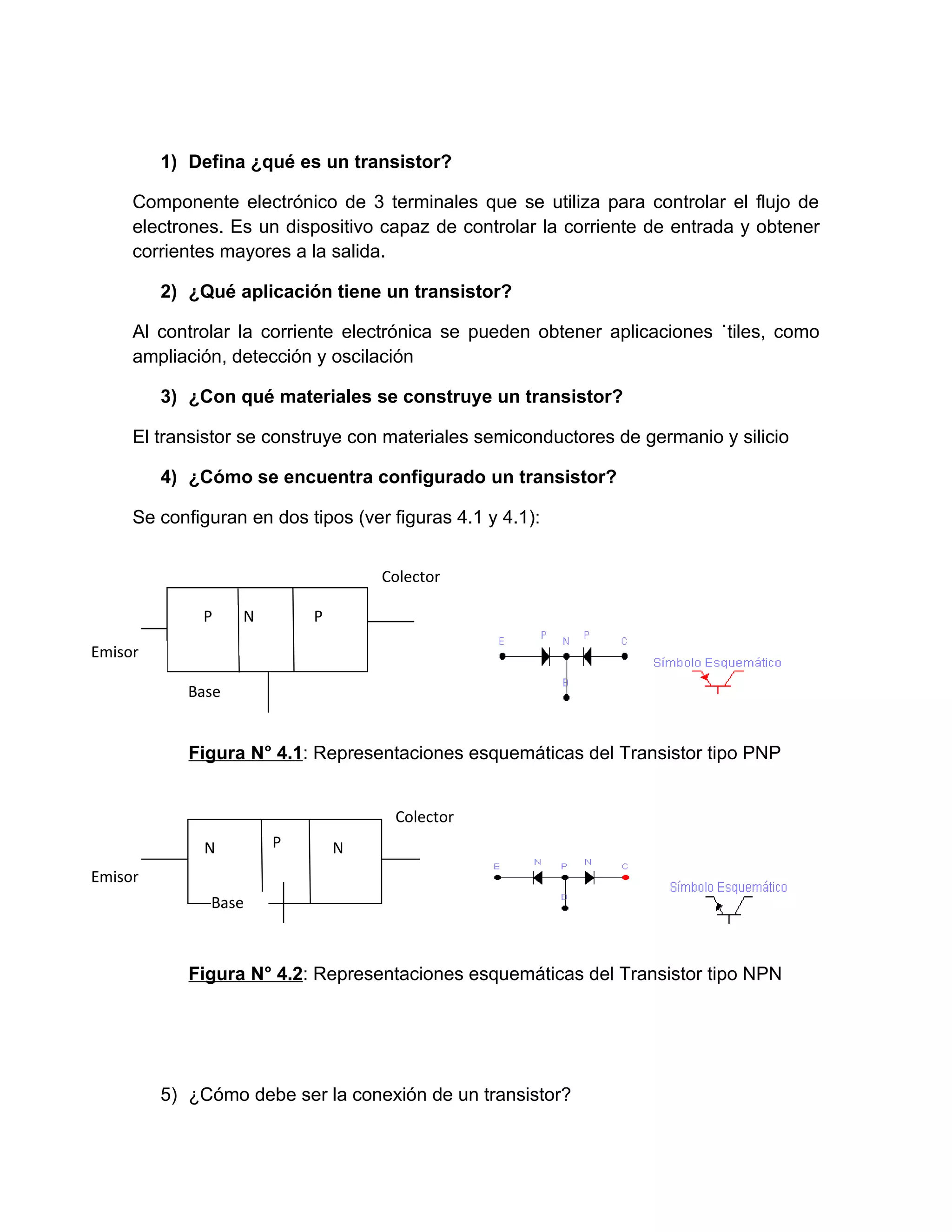 El documento define el transistor como un dispositivo electrónico de 3 terminales que controla el flujo de electrones y puede amplificar corrientes. Explica que los transistores se construyen con materiales semiconductores como germanio y silicio y pueden configurarse como NPN o PNP. También describe las aplicaciones de los transistores, incluidas la amplificación y detección, y las conexiones básicas de los transistores como base común, emisor común y colector común. Finalmente, introduce el fototransistor y el transistor de potencia, explic