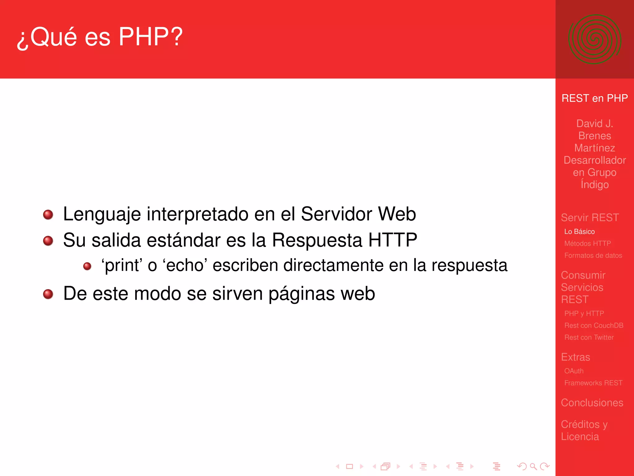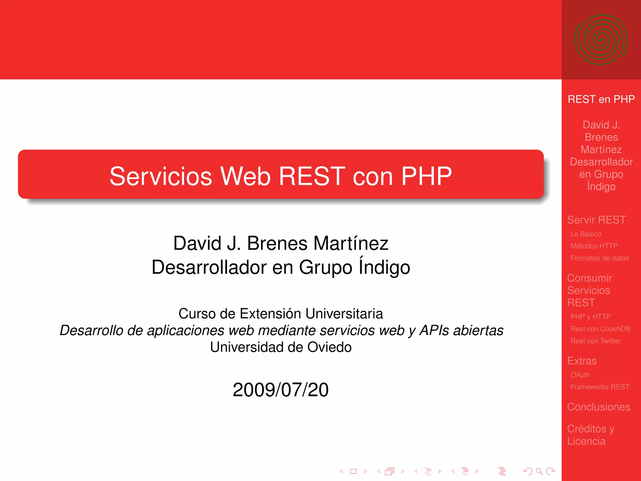 El documento trata sobre la implementación de servicios REST utilizando PHP, abarcando aspectos como métodos HTTP, formatos de datos, y autenticación mediante OAuth. Se incluyen ejemplos prácticos para realizar peticiones GET, POST, PUT y DELETE, así como el uso de bibliotecas como cURL y el trabajo con bases de datos como CouchDB. Además, se mencionan frameworks y herramientas que facilitan el desarrollo y el consumo de servicios REST en el ámbito web.