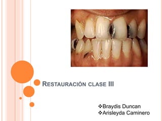 Este documento describe las características y el tratamiento de lesiones cariogénicas de Clase III. Estas lesiones se producen debido a una acumulación de placa en la región interproximal causada por una superficie de contacto deficiente entre dientes. El tratamiento implica la remoción de caries, la preparación cavitaria y la restauración con resina compuesta aplicada en capas de diferentes opacidades para lograr una estética adecuada. Las restauraciones de Clase III representan un desafío debido a su configuración y ries