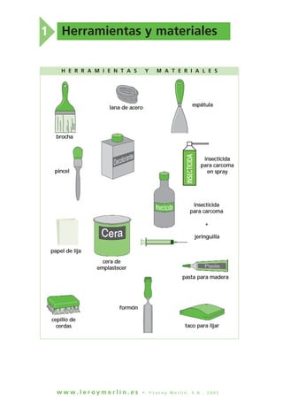 Este documento proporciona instrucciones para restaurar muebles de madera. Primero, el mueble debe limpiarse eliminando cualquier barniz o pintura existente mediante el uso de un decapante. Luego, la madera se lija y trata con un decolorante o insecticida si es necesario. Finalmente, cualquier agujero de insectos se rellena con cera y la superficie se pule para completar la restauración.