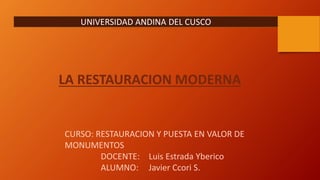 El documento describe la evolución histórica de la restauración del patrimonio arquitectónico, abordando teorías desde el siglo XVII que han influenciado la conservación de monumentos y su valoración artística. Se presentan diversas corrientes, como la restauración estilística de Viollet-le-Duc y la visión romántica de Ruskin, destacando los principios modernos propuestos por Camillo Boito, quien aboga por la conservación sin eliminar la autenticidad del monumento. Boito sentó las bases de la restauración científica, creando normas que equilibran la intervención y el respeto por el patrimonio histórico.