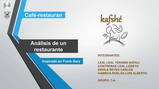 El documento presenta un análisis para el diseño de un café-restaurante inspirado en el arquitecto Frank Gehry. Se describe la ubicación del lote, la distribución de áreas propuesta, y los conceptos de diseño a utilizar como proporción, simetría, color, textura y equilibrio. También se mencionan los posibles muebles y los conceptos de Frank Gehry a considerar como iluminación natural, adición/sustracción, jerarquía y masa.