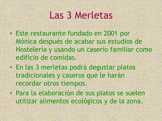 Este restaurante llamado Las 3 Merletas fue fundado en 2001 por Mónica en un caserío familiar en Brihuega, Guadalajara, y ofrece platos tradicionales y caseros elaborados principalmente con alimentos ecológicos y de la zona como cocido monicato, fideua de pescado, costillas con salsa barbacoa y flan casero.