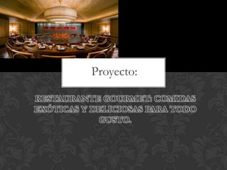 Este documento presenta un proyecto para abrir un restaurante gourmet que ofrecerá platos exóticos de diferentes culturas. El restaurante estará ubicado en Medellín y contará con chefs experimentados en cocina internacional. Se promoverá a través de anuncios en periódicos, guías telefónicas y revistas de aerolíneas para atraer a clientes interesados en nuevas experiencias culinarias. El objetivo es que las personas conozcan otras culturas a través de su gastronomía y generar ingresos con