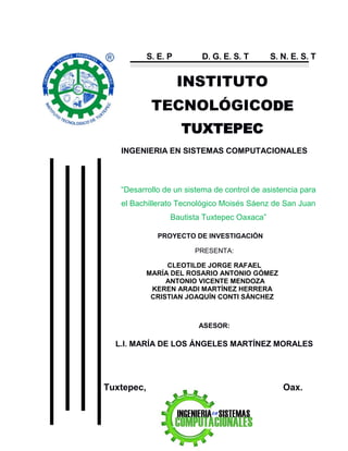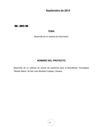Este documento presenta el diseño de un sistema de control de asistencia para el Bachillerato Tecnológico “Moisés Sáenz” en Tuxtepec, Oaxaca. Actualmente el registro de asistencia del personal se realiza de forma manual, lo que causa problemas como pago incorrecto de nóminas. El objetivo del proyecto es analizar, diseñar y desarrollar un software que permita generar reportes de horas trabajadas por el personal de forma automatizada. Esto beneficiará a la institución y al personal agilizando los procesos administr