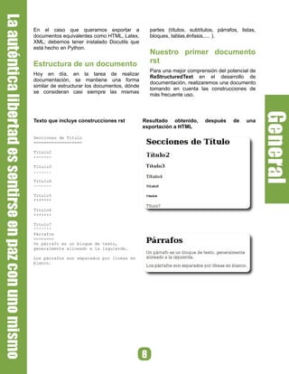 ReStructuredText es un lenguaje de marcas ligero para crear documentos de forma rápida y sencilla. Permite estructurar documentos usando títulos, párrafos, listas y tablas. Los archivos RST se pueden exportar a formatos como HTML, LaTeX y XML usando la herramienta Docutils. RST es útil para documentación desde pequeños fragmentos hasta manuales extensos.