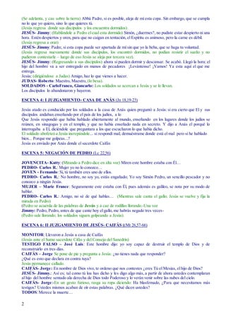 Este documento presenta la dramatización de la Pasión de Cristo a través de siete escenas: 1) el lavado de pies, 2) la Última Cena, 3) Jesús orando en el Huerto de Getsemaní, 4) Jesús ante Anás y Caifás, 5) la negación de Pedro, 6) Jesús ante Pilatos, y 7) la coronación de Jesús con espinas. A lo largo de las escenas, Jesús es interrogado y juzgado por los sumos sacerdotes y Pilatos antes de ser entregado para ser crucificado.
