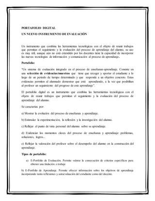 El documento describe el portafolio digital como un instrumento que combina herramientas tecnológicas para reunir trabajos que permitan el seguimiento y evaluación del aprendizaje del estudiante. Explica que el portafolio digital muestra la evolución del aprendizaje, estimula la experimentación y reflexión del estudiante, y refleja la perspectiva del estudiante y el profesor sobre el desempeño y logros del estudiante. También describe los tipos de portafolios digitales y sus características, ventajas y desvent