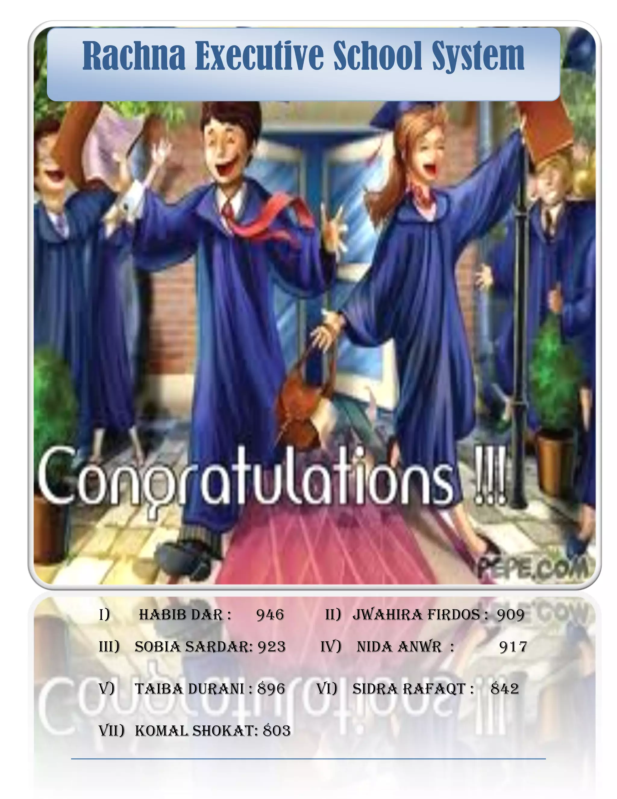 La lista presenta los nombres y puntajes de 7 estudiantes de la Escuela Ejecutiva Rachna. El estudiante con el puntaje más alto fue Habib Dar con 946, seguido por Jwahira Firdos con 909 y Sobia Sardar con 923.