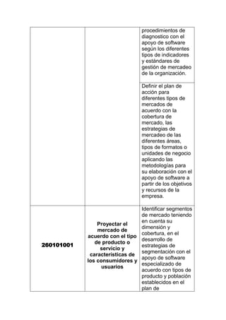 Este documento presenta varios resultados de aprendizaje relacionados con competencias laborales en mercadeo y ventas. Incluye objetivos como proyectar el mercado según características de consumidores, identificar comportamientos de mercado a partir de investigación y tendencias, y negociar productos y servicios de acuerdo a condiciones del mercado y políticas de la empresa.