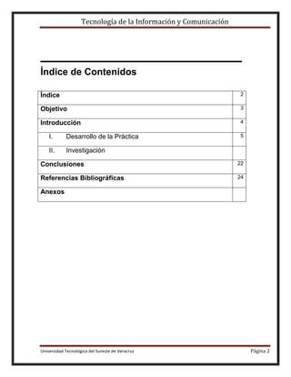Este documento presenta los resultados de una práctica sobre tecnologías de la información y comunicación realizada por tres estudiantes. Incluye información sobre temas como RIA, arquitectura cliente-servidor, JavaScript, jQuery, HTML5 y Web 2.0. El documento describe los beneficios de las RIA y las diferencias entre HTML4 y HTML5. Concluye que HTML5 simplificará el desarrollo web al proporcionar nuevos elementos semánticos y compatibilidad multiplataforma.
