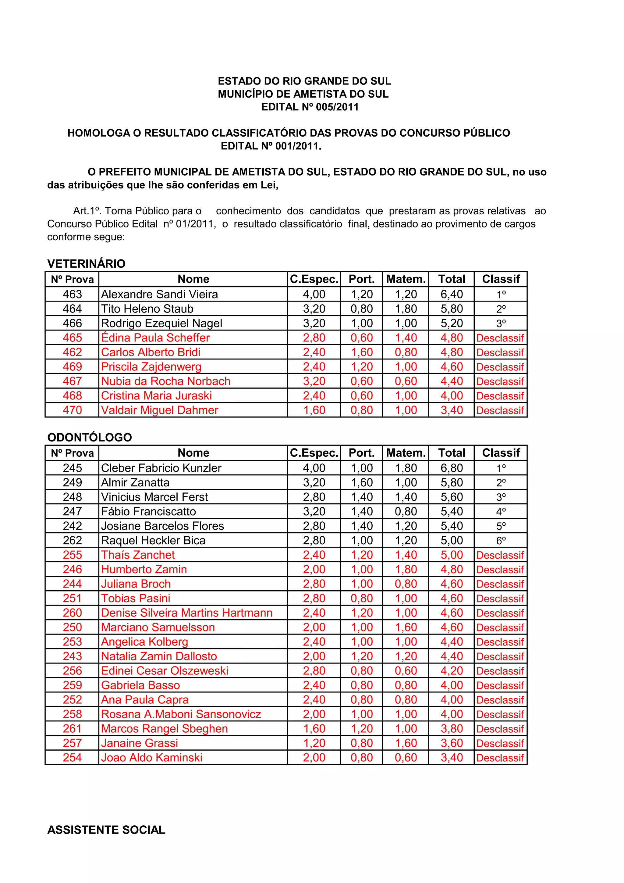 Este documento presenta los resultados de las pruebas de un concurso público para varios cargos en el municipio de Ametista do Sul en Brasil. Para cada cargo, lista el nombre de los candidatos y sus puntajes en las diferentes secciones de la prueba y su clasificación final. El documento homologa los resultados de las pruebas del concurso público para proveer cargos de veterinario, odontólogo, asistente social, psicólogo, enfermero, farmacéutico, médico clínico y técnico de control interno.