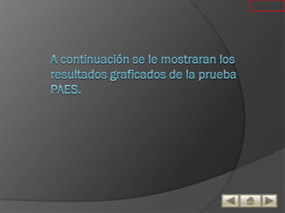 Este documento presenta información sobre la Prueba de Aptitud para la Educación Superior (PAES), incluyendo su objetivo, estructura, resultados y recomendaciones. La PAES evalúa las competencias desarrolladas por los estudiantes en el bachillerato en las áreas de matemáticas, lenguaje, ciencias sociales y ciencias naturales. Los resultados muestran el desempeño de los estudiantes por departamento, género y sector educativo. Se recomienda que las escuelas se enfoquen en el desarrollo de las