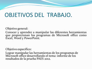 Este documento presenta los resultados de la Prueba de Aprendizaje y Aptitudes para Egresados de Educación Media (PAES) para los años 2011-2012 en tres oraciones. Hubo un ligero aumento en el número de estudiantes evaluados en 2012 y las mujeres superaron ligeramente a los hombres. La calidad de educación en las escuelas públicas sigue siendo inferior a la de las privadas según los resultados de la PAES.
