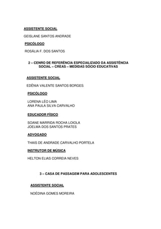 Este documento lista los nombres de los empleados de varios programas y departamentos de asistencia social en Brasil. Incluye programas para la erradicación del trabajo infantil, refugios para adolescentes, centros de referencia especializados, casas de apoyo para la violencia contra la mujer, programas para personas en situación de calle, programas de protección social básica como Bolsa Familia e InfoLeite, y departamentos de combate a la pobreza y mejoramiento habitacional.