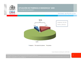 Este documento presenta los resultados de la Encuesta de Caracterización Socioeconómica Nacional (CASEN) de 2009 realizada por el Ministerio de Planificación. Según la encuesta, en 2009 el 15,1% de la población chilena se encontraba en situación de pobreza y el 3,7% en situación de indigencia. La pobreza es mayor en la zona rural que en la urbana y ha disminuido desde 1990, aunque persisten brechas entre regiones y grupos. El documento analiza la situación de pobreza por diferentes variables socioe