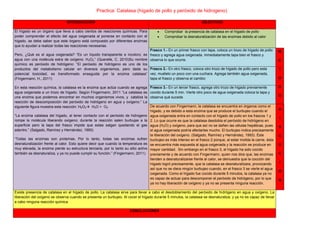 El documento describe un experimento para comprobar la presencia de la enzima catalasa en el hígado de pollo mediante la adición de peróxido de hidrógeno. Se utilizaron tres frascos: en el primero con hígado fresco, en el segundo con hígado molido y en el tercero con hígado cocido. Solo los primeros dos frascos mostraron burbujeo, indicando que la catalasa descompuso el peróxido de hidrógeno en agua y oxígeno. El tercer frasco no presentó