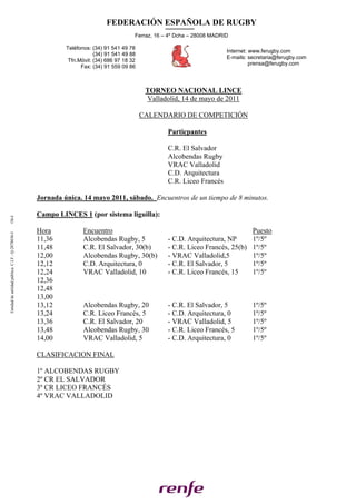Este documento presenta el calendario de un torneo nacional de rugby en Valladolid el 14 de mayo de 2011. Participarán 5 equipos que jugarán partidos de 8 minutos en una sola jornada siguiendo un sistema de liguilla. Se detallan los horarios y resultados de los encuentros, así como el orden final de clasificación con Alcobendas Rugby en primer lugar.