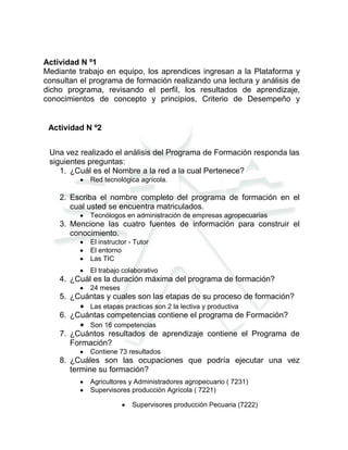 Este documento resume las actividades realizadas por los aprendices en el programa de formación "Tecnólogos en administración de empresas agropecuarias" del SENA. Los aprendices analizaron el programa de formación, identificaron su nombre, duración y competencias. Adjuntaron imágenes relacionadas con contenidos del programa como cuerpos de agua y concluyeron que la formación los preparará para los sectores agrícola, pecuario y administrativo.