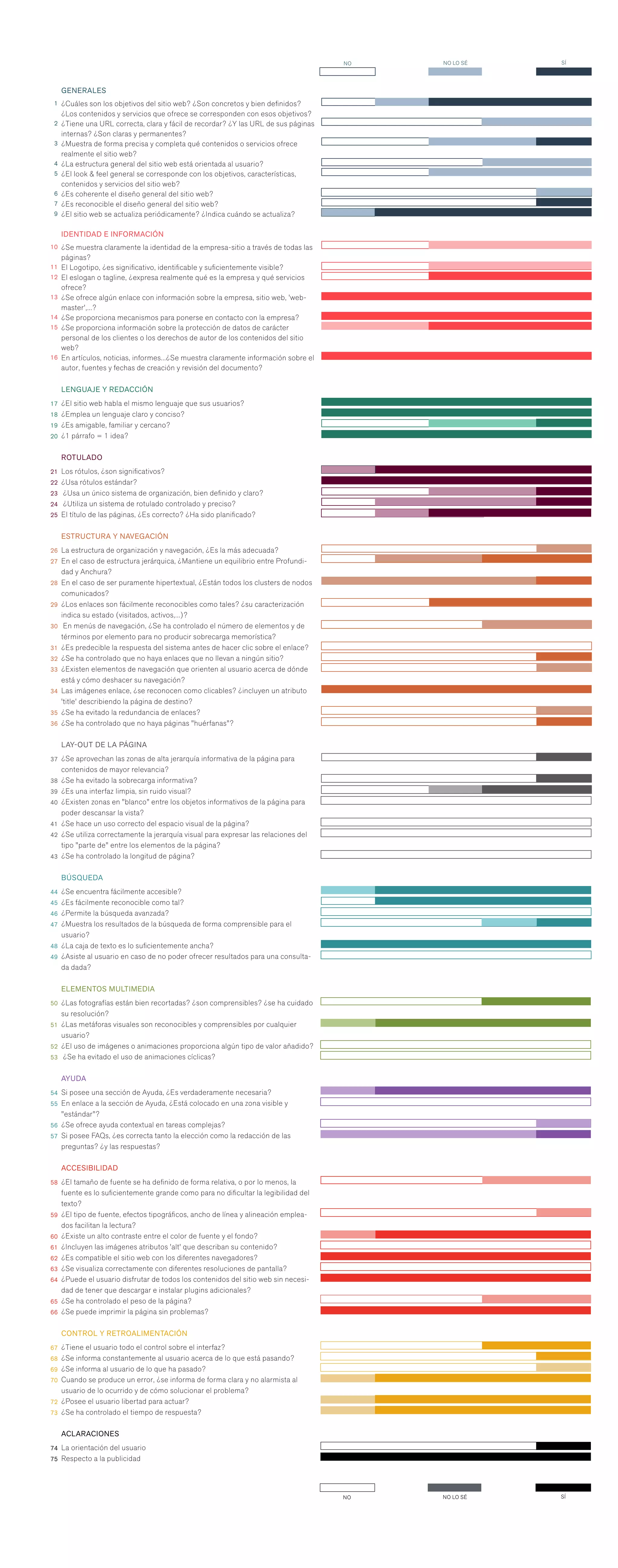 Este documento evalúa los criterios de calidad de un sitio web en 75 preguntas organizadas en 15 secciones. Las preguntas cubren objetivos, identidad, lenguaje, estructura, navegación, diseño, búsqueda, multimedia, ayuda, accesibilidad, interacción y publicidad. El objetivo es evaluar si un sitio web es fácil de usar, navegar y comprender para los usuarios.