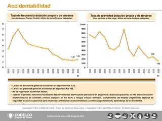 En el primer semestre de 2014, Codelco reportó una tasa de frecuencia de accidentes de 1.43 y una tasa de gravedad de 156, sin accidentes fatales. Durante este período, la producción de cobre alcanzó 877 mil toneladas, un aumento del 4% en comparación con el mismo período del año anterior, pero las ventas disminuyeron en 7%. La empresa también avanzó en mejoras de productividad y costos, logrando ahorros significativos en insumos y servicios.