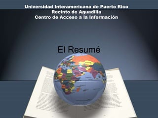Este documento ofrece instrucciones sobre cómo crear un resumé efectivo. Explica que un resumé es un breve resumen del historial profesional y educativo de una persona. Luego, detalla los elementos clave que debe contener un resumé, como los datos personales, objetivo profesional, experiencia laboral, educación y habilidades. También proporciona consejos sobre el formato y estilo del resumé, así como ejemplos de verbos y tipos de resumés. El objetivo es ayudar a los estudiantes a reconocer los componentes