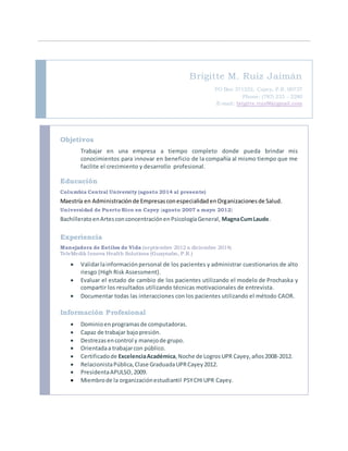 El documento presenta el currículum de Brigitte M. Ruiz Jaimán. Actualmente cursa una maestría en administración de empresas con especialidad en organizaciones de salud en la Universidad Central de Columbia. Obtuvo un bachillerato en artes con concentración en psicología general de la Universidad de Puerto Rico en Cayey. Trabajó previamente como Manejadora de Estilos de Vida en TeleMedik Innova Health Solutions, donde evaluaba el riesgo de pacientes y documentaba interacciones. Busca empleo a tiempo completo donde pueda aplicar