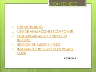 Este documento presenta un curso de actualización sobre el uso de recursos informáticos. Cubre temas como la creación de blogs, el uso de animaciones en PowerPoint, la descarga y edición de audio y video de Internet, e insertar audio y video en PowerPoint.