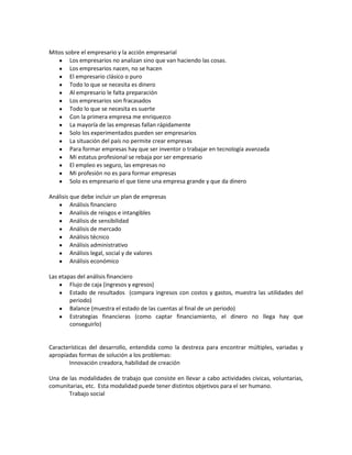 El documento resume conceptos clave de economía monetaria como las desventajas del trueque, las funciones del dinero como medio de intercambio, unidad de cuenta y reserva de valor, y por qué estas últimas dos se consideran funciones derivadas. También cubre conceptos sobre emprendimiento como los modelos de transformación empresarial, mitos sobre empresarios, y análisis requeridos en un plan de negocios.