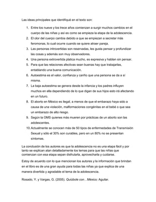 El documento resume un libro que trata temas de la adolescencia como drogas, sexo y cambios físicos y mentales. El libro explica estos temas de una manera divertida para ayudar a los adolescentes a entender y enfrentar los cambios. El libro también cubre temas como relaciones, autoestima, anticonceptivos y problemas emocionales. Los autores concluyen que la adolescencia no es fácil y el libro pretende ayudar a los adolescentes a disfrutar y cuidarse durante esta etapa.