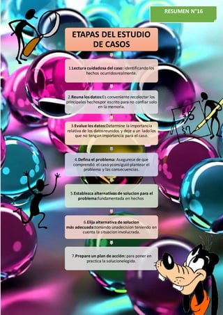 El documento describe las 7 etapas del estudio de casos. Estas etapas incluyen: 1) leer cuidadosamente el caso para identificar los hechos, 2) reunir los datos principales por escrito, 3) evaluar la importancia de los datos, 4) definir el problema y sus consecuencias, 5) establecer alternativas de solución fundamentadas en los hechos, 6) elegir la alternativa más adecuada considerando la situación, y 7) preparar un plan de acción para implementar la solución elegida.