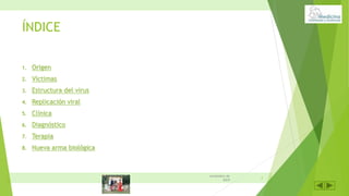 El documento describe un brote de fiebre hemorrágica de Marburgo en Angola entre 2004-2005 que resultó en 374 casos y 329 muertes, con una tasa de mortalidad del 88%. Describe la estructura y replicación del virus de Marburgo, los síntomas clínicos que incluyen diarrea, vómitos y hemorragias, y que la muerte suele ocurrir entre el octavo y decimosexto día. No existe un tratamiento específico más allá del apoyo sintomático y el aislamiento de pacientes.
