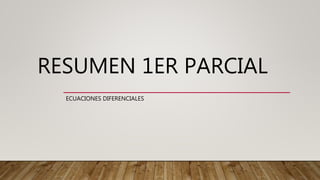 1) El documento presenta conceptos básicos sobre ecuaciones diferenciales ordinarias de primer y segundo orden, incluyendo clasificación, soluciones, métodos de resolución como variables separables, factores integrantes, sustituciones, y ecuaciones lineales. 2) Se explican conceptos como conjuntos fundamentales de soluciones y reducción de orden para ecuaciones de segundo orden. 3) Finalmente, se introducen ecuaciones diferenciales lineales de orden superior, operadores diferenciales, y métodos para ecuaciones homogéneas y no homogéneas.