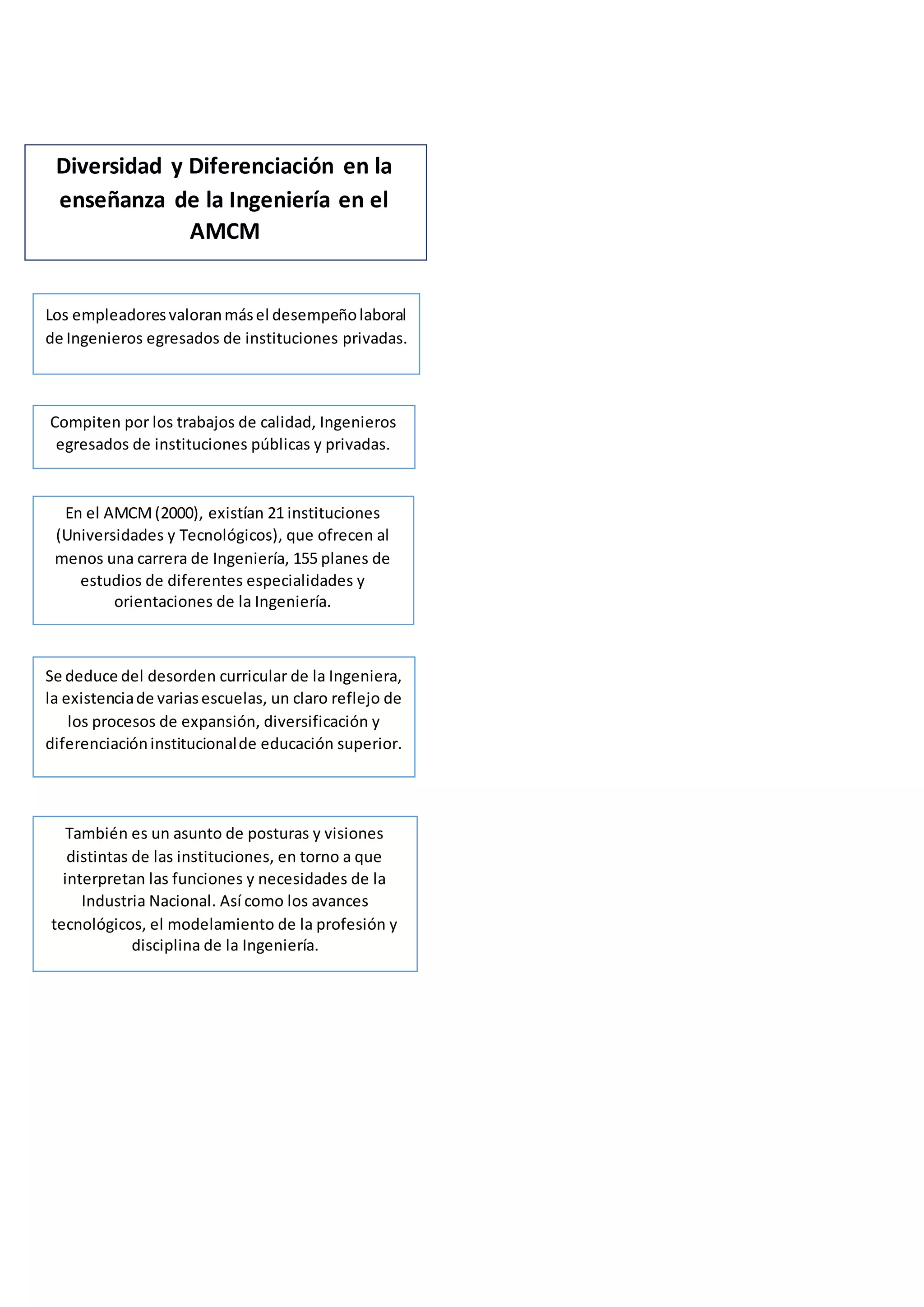 El documento describe la diversidad y diferenciación en la enseñanza de la ingeniería en el AMCM. En el año 2000, había 21 instituciones que ofrecían al menos una carrera de ingeniería con 155 planes de estudio de diferentes especialidades. El desorden curricular refleja la expansión, diversificación y diferenciación institucional de la educación superior, así como posturas distintas sobre las funciones y necesidades de la industria nacional y los avances tecnológicos.