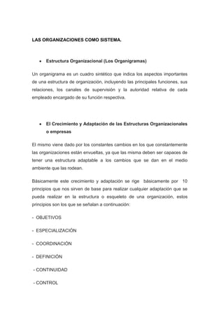 Este documento resume conceptos clave sobre modelos administrativos como estructuras organizacionales, procesos de fusión entre organizaciones, liderazgo, cambio organizacional y procesos empresariales. Explica que una organización debe adaptarse constantemente para responder a cambios en el entorno y lograr sus objetivos de manera eficiente.