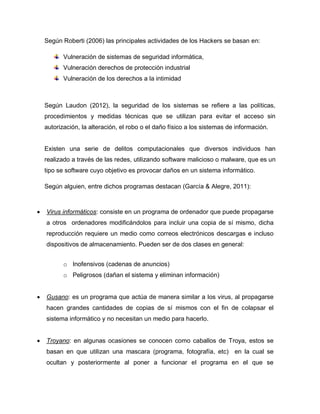 Este documento habla sobre la seguridad en Internet. Explica que debido al intercambio masivo de información en la web, se crearon programas maliciosos que perjudican a los usuarios. También describe diferentes tipos de software dañino como virus, gusanos y troyanos, así como técnicas para proteger sistemas como antivirus, firewalls y encriptación. Resalta que a pesar de las medidas de seguridad, es importante que los usuarios sean cuidadosos con la información que comparten en línea.