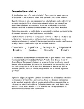 La computación evolutiva se inspira en la evolución biológica para resolver problemas. Utiliza técnicas como los algoritmos genéticos que representan soluciones como cromosomas y usan operadores como la selección, el cruce y la mutación para generar nuevas soluciones. Estos métodos se han aplicado con éxito en diversos dominios como la ingeniería, la medicina y las ciencias sociales.