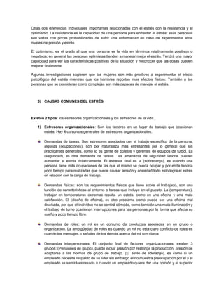 Este documento discute el estrés, sus causas y consecuencias, así como estrategias para manejarlo. Brevemente: 1) El estrés es la respuesta a estímulos que colocan demandas excesivas y puede variar entre individuos. 2) Las causas comunes de estrés incluyen factores laborales como sobrecarga de trabajo y problemas interpersonales, así como eventos de vida. 3) El estrés puede tener consecuencias conductuales, psicológicas y en el desempeño si no se maneja adecuadamente.