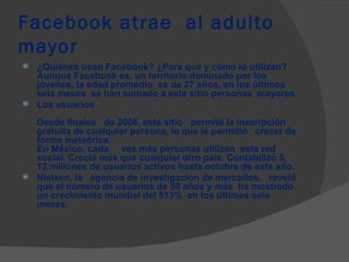 El documento describe cómo el número de usuarios mayores de 50 años en Facebook ha crecido un 513% en los últimos seis meses, aunque la edad promedio de los usuarios es de 27 años. Facebook ha permitido el registro gratuito de cualquier persona desde 2006, lo que ha contribuido a su rápido crecimiento en México y en otros países.