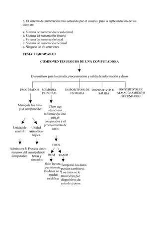 Este documento presenta una introducción a los conceptos básicos de informática. Explica que la informática involucra el procesamiento automático de datos utilizando computadoras. Luego, describe los componentes principales de un sistema informático, incluido el hardware como la CPU, memoria y dispositivos de entrada/salida, y el software. Finalmente, detalla varios dispositivos de almacenamiento secundario como discos duros y ópticos.